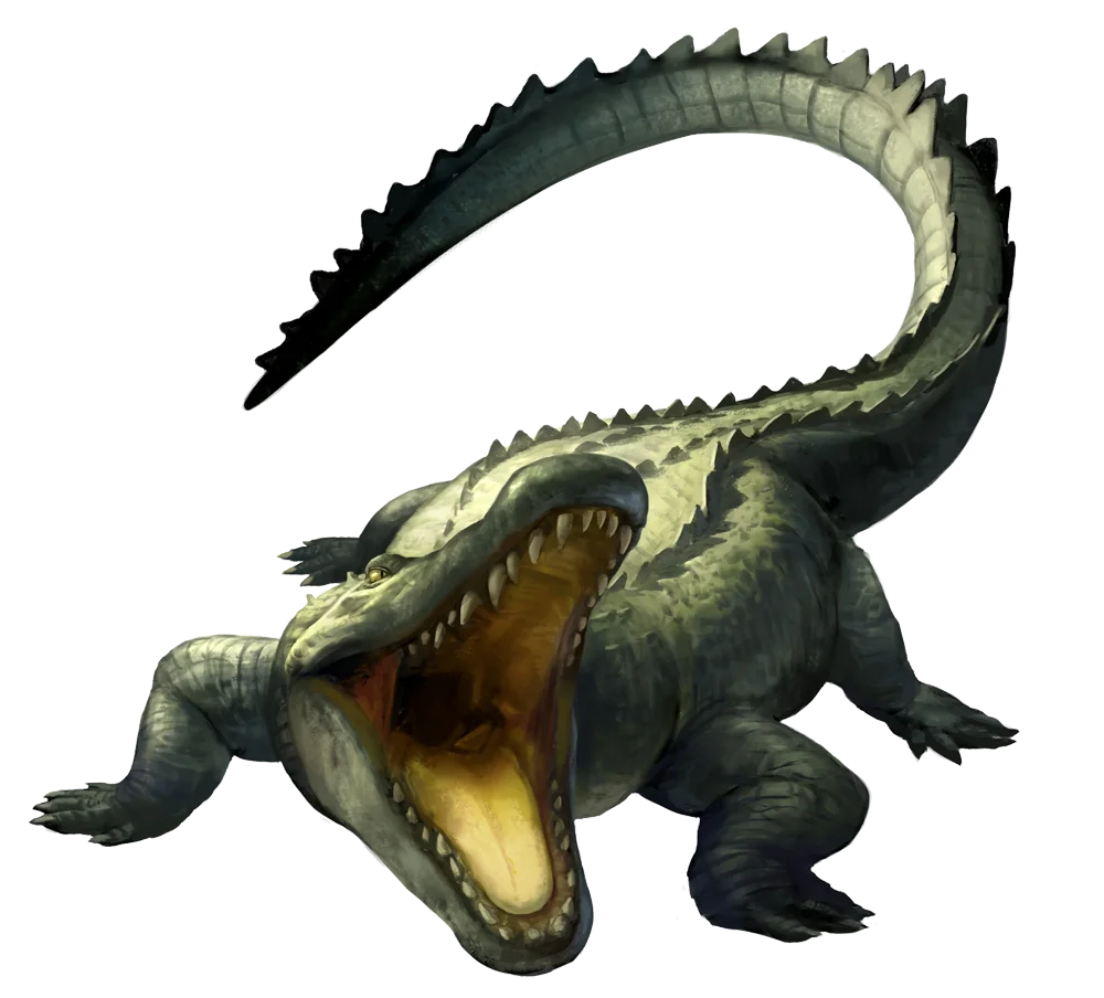 Crocodiles can be found basking on riverbanks, lurking in swamps, or floating in lakes. They are usually indistinguishable from logs when viewed from afar—at least until they attack. Alligators have similar statistics, but because they often live in more temperate climates, they endure cold temperatures better. Unlike alligators, crocodiles can tolerate salt water. Both are formidable predators that are likely to devour careless adventurers who fail to watch where they step.