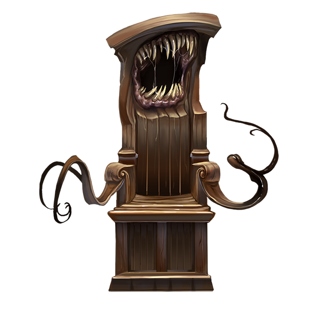 Thought to be the result of a failed experiment meant to animate objects or a sinister alghollthu creation, mimics are clever monsters that can take the form of common manufactured objects. Mimics are ambush predators and voracious eaters, surprising their prey through their uncanny ability to mimic the form of common furniture and miscellany. They remain disguised until unsuspecting adventurers happen by, then they lash out in ambush.