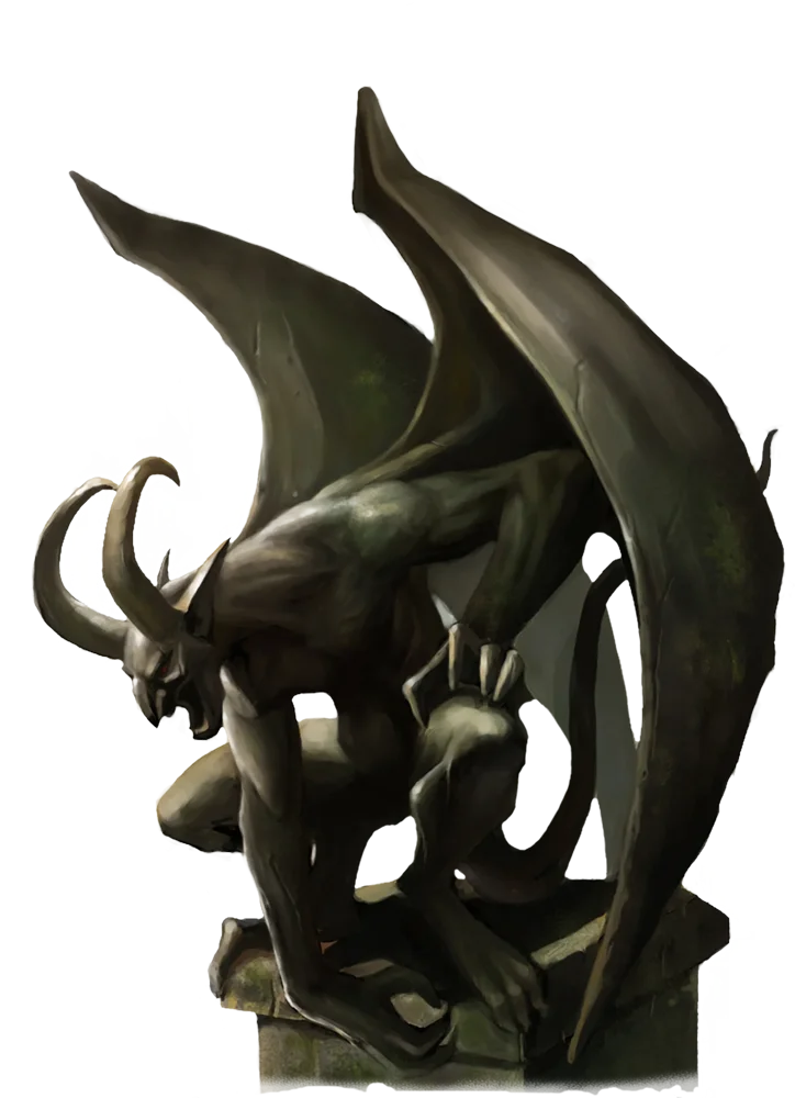 Gargoyles are monstrous hunters made of elemental stone. They use their resemblance to decorative statues to hide in plain sight in cities during the day and descend upon unlucky pedestrians at night. Their most common form is that of a horned humanoid with bat-like wings, but individual gargoyles show a great deal of variation, with some appearing more or less humanoid and others resembling no known creature. A gargoyle's features are not fixed; city-dwelling gargoyles who remain in the same locale long enough slowly morph, day by day, to match the style of the local architecture. These patient monsters can stay disguised for long stretches of time as they patiently await an opportunity to strike.