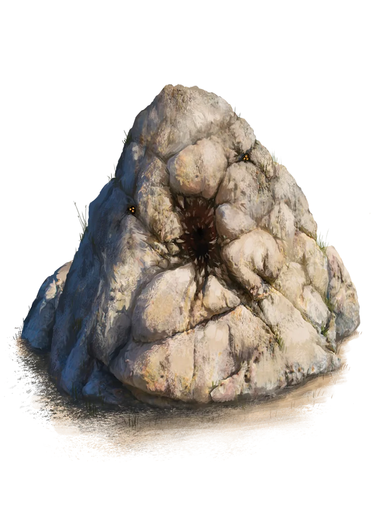 Grikkitogs, also known as the “hungry earth,” are strange parasites from the Plane of Earth that infest earth, rock, and stone in order to feed their endless hunger. A young grikkitog is a formless apparition until it corrupts an earth elementalhost, forming the grikkitog's core. A grikkitog can then possess the earth and stone nearby with its voracious essence, forming maws and eyes all around it. These creatures can be particularly dangerous to small creatures that lair within gaps among rocks, as well as mountain climbers searching for the perfect handhold.
