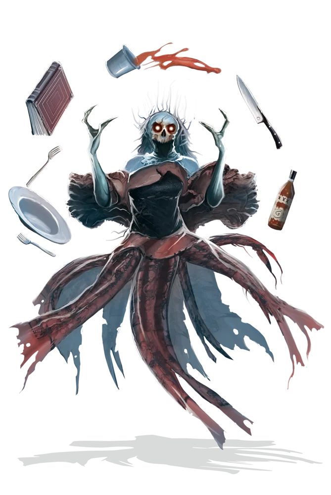 A poltergeist needs items to hurl as weapons, and over the centuries of use, only durable objects survive its rampages. Silver dinnerware, hatchets, and books might all be found in a poltergeist's collection.