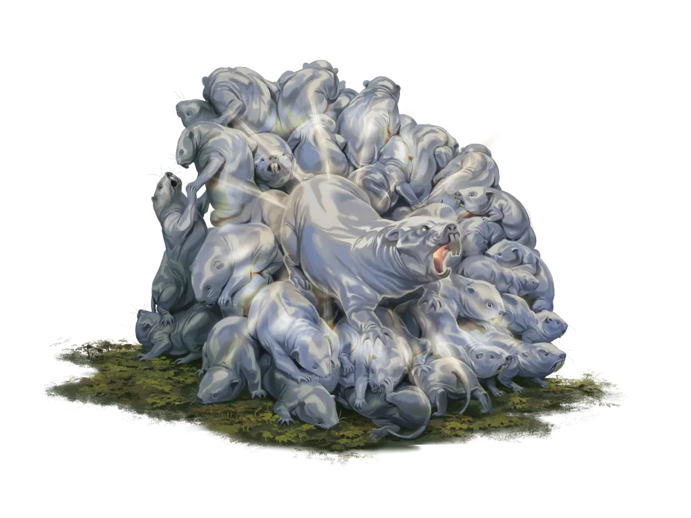 These tenacious little rodents travel in massive swarms across the desert, using the sun both as shield and sword during their long marches. Unlike other rodents, vibrant pups are eusocial, causing them to behave more like insects than other rodents. Only the queen can reproduce, and is fiercely protected for that reason. This social structure enables them to viciously attack and act as a single unit. Each of the pups also have specific roles within the family and the swarm. The worker pups gather and dig while in a den, but will act as a shield to protect the more valuable fighter pups while swarming.