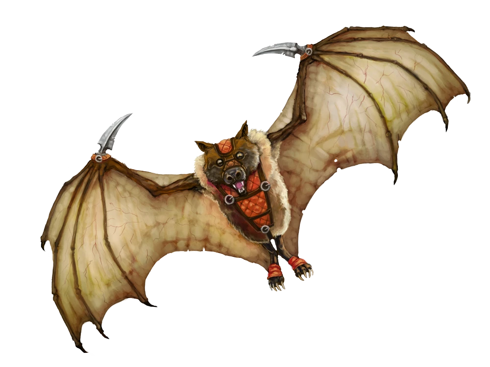 Trained to work in tandem with a master, this giant bat is an expert at tracking with its echolocation and harrying foes with the buffets of its mighty wings. Such a creature is typically encountered with the pack leader.