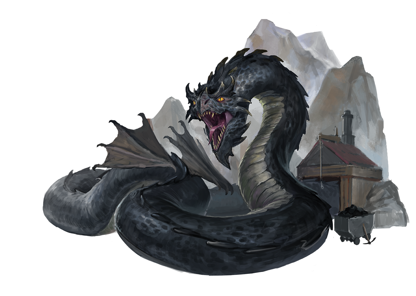 Bidas are black-scaled dragons with long, serpentine bodies and bat-like wings. Their legs and claws are smaller than those of most dragons, but their powerful undulating coils, like those of a boa constrictor, are potent weapons capable of squeezing the life from several unfortunate victims at a time.