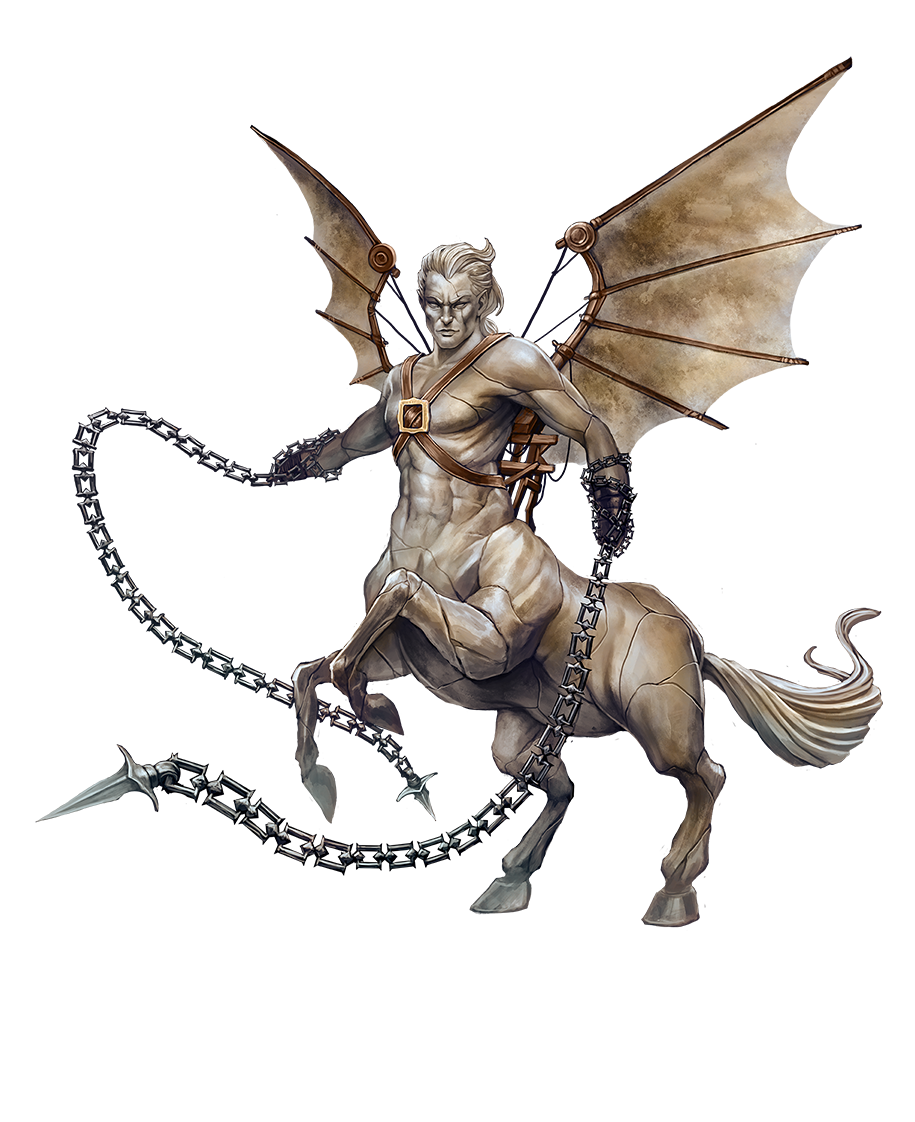 A zelekhut is a bounty hunter and executioner. The zelekhut resembles a mechanical centaur crafted from silvery metal with golden clockwork wings adorning its back. Instead of hands, the zelekhut's arms end in long, barbed chains that crackle with electricity. Whether sent by the powers of Axis or summoned by mortal authorities, the zelekhut seeks out those who continually evade justice—either through active flight, or by abusing their power and station—so as to bring justice to the multiverse's most notorious fugitives and criminals. Indeed, many a zelekhut's quarry are as famous for their ability to evade capture as for the crimes they commit.