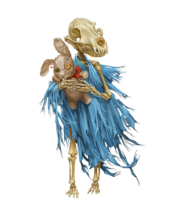 Beware the haunting sobs of the attic whisperer, for they carry the pained wrath of an abandoned child who perished due to the neglect or absence of their caretakers. Animated by loneliness, the embittered spirit binds itself to the material world in a body made of bits and oddments of a lost childhood—wooden blocks, scraps of blankets, ratty dolls, buttons, carved trinkets, and glass marbles. To give themselves the semblance of a head, they top their patchwork bodies with a small animal's skull.