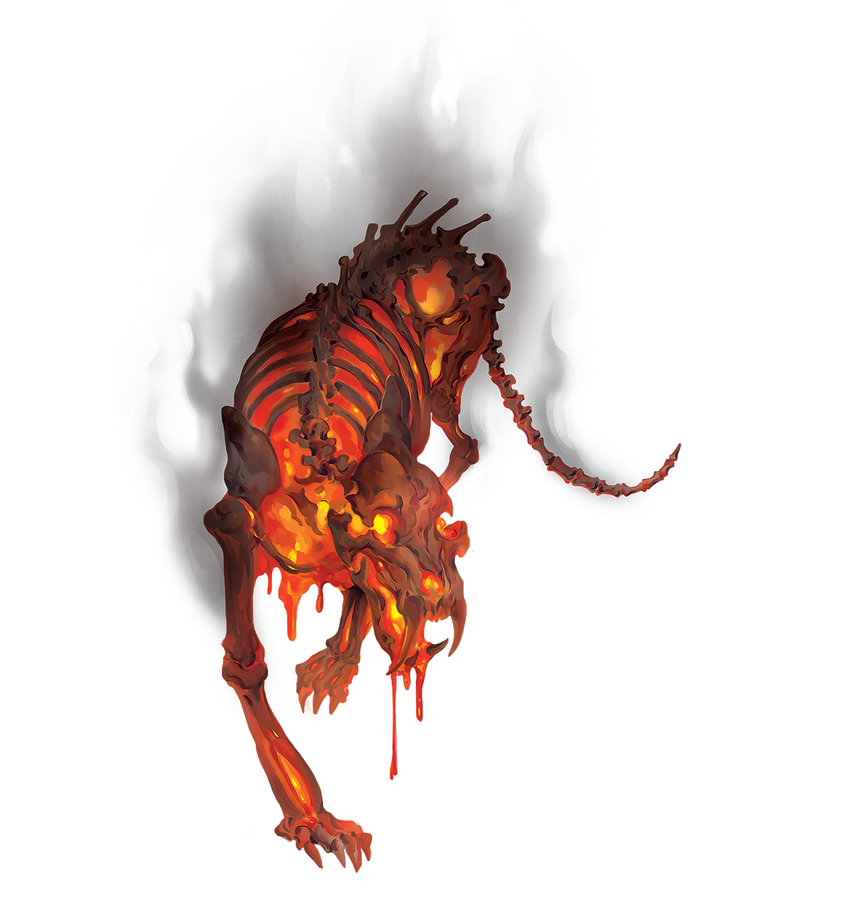 Hellcats are devious predators native to the fiery pits of Hell. While the fiendish creatures appears as skeletal smilodons, their bones smoking with heat and dripping with boiling blood, they are not undead. They are living hellspawn with transparent flesh that reveals their burning skeletons. A typical hellcat is 9 feet long and weighs 1,000 pounds.
