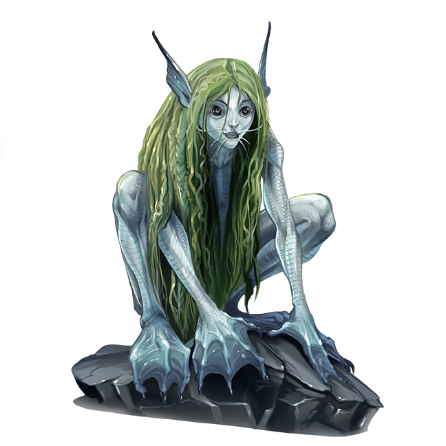 Nixies appear as aquatic humanoids the size of a child, with large eyes, catfish-like whiskers, and webbed fingers and toes. They have scaly skin, pointed ears, and long hair the color of seaweed. Nixies often form small communities, even building underwater societies if their numbers are great enough. In many cultures' folklore, there are stories of nixie nations hidden at the bottom of particularly large lakes.