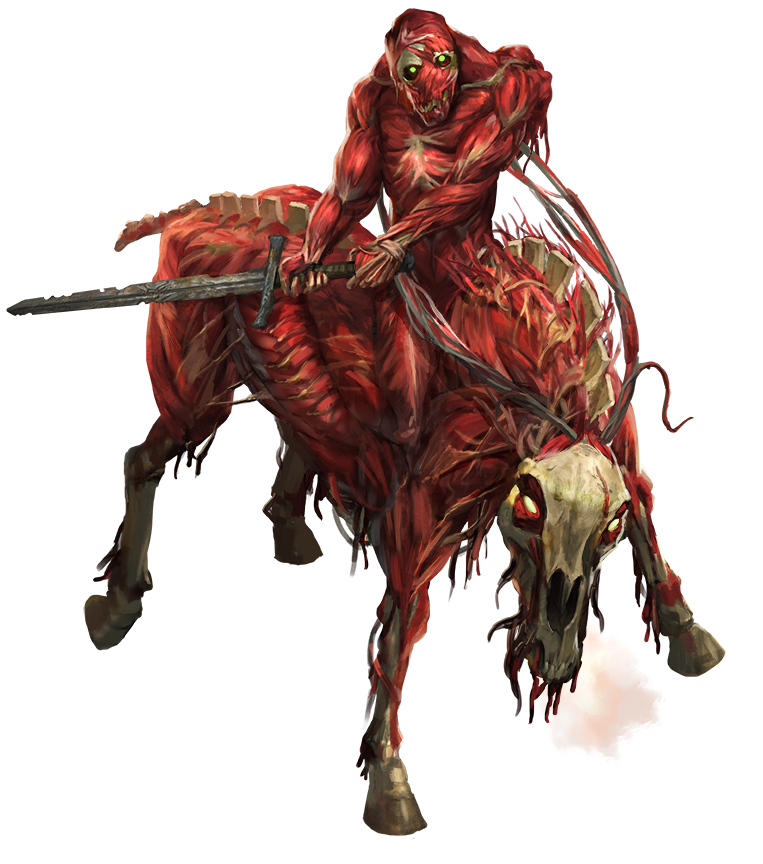When a nuckelavee rides forth from its domain, it wreaks a trail of destruction across the lands surrounding its path. Nuckelavees are considered among the cruelest and most monstrous fey, seen by some as just desserts visited upon those who would befoul the waters of their homes. A nuckelavee, though, doesn't discriminate between those who pollute and those who merely have the misfortune to be in the wrong place at the wrong time.