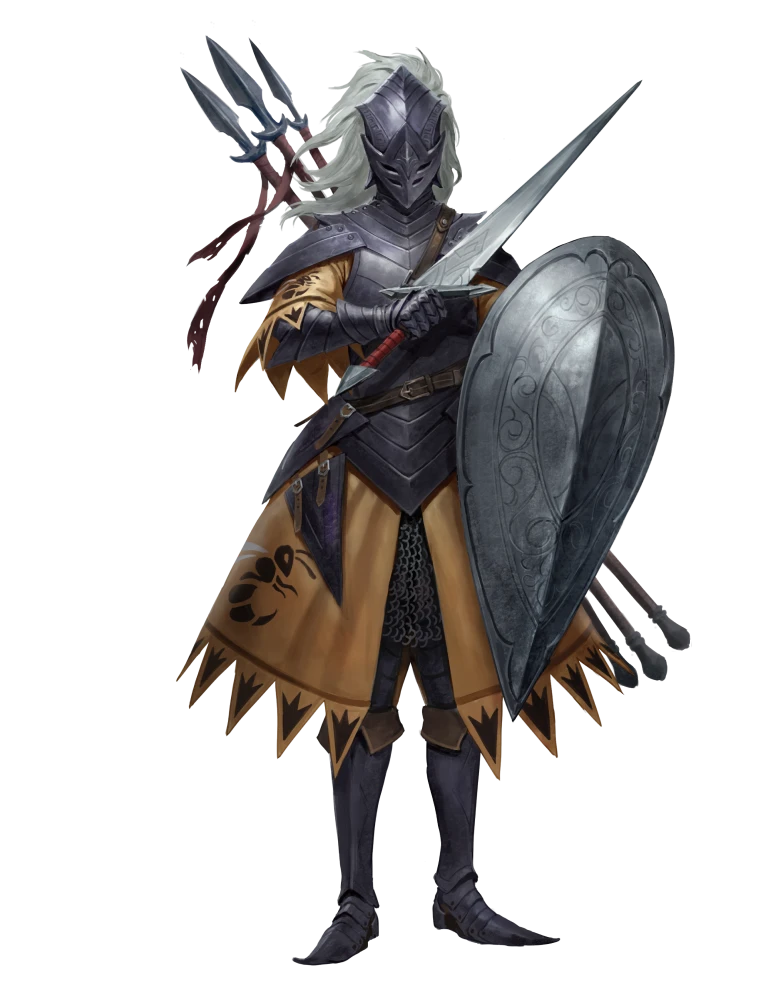 Melee [one-action] bastard sword +18 [+13/+8] (magical, two-hand d12), Damage 1d8+10 slashingMelee [one-action] spear +17 [+12/+7], Damage 1d6+10 piercingMelee [one-action] gauntlet +17 [+13/+9] (agile, free-hand), Damage 1d4+10 bludgeoningRanged [one-action] spear +17 [+12/+7] (thrown 20 feet), Damage 1d6+10 piercingIntimidating Strike [two-actions] (emotion, fear, fighter, mental) The knight makes a melee Strike. If it hits and deals damage, the target is frightened 1, or frightened 2 on a critical hit.Rearming Advance [one-action] The knight Strides or Steps. During this movement, they can Interact to swap from wielding their bastard sword in two hands to wielding it in one hand and wielding their shield in the other, or vice versa. This Interact action doesn't trigger reactions that can be triggered by manipulate actions.Warding Shift [one-action] Requirements The knight is adjacent to a willing ally; Effect The knight moves an adjacent willing ally 5 feet in any direction and can Step into the space the ally vacated.