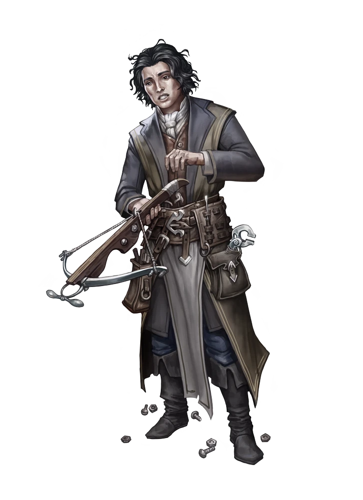 Multiple engineers use firearms, technology that's present in relatively small numbers on Golarion. These are uncommon, simple, and martial weapons, so many player characters can use them. If you want to avoid putting the items in their hands, swap out the firearms with crossbow or similar weapons. More firearms and the gunslinger class appear in Pathfinder Guns & Gears.