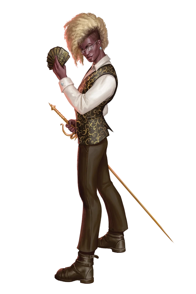 Melee [one-action] rapier +23 [+18/+13] (deadly d8, disarm, finesse, magical), Damage 2d6+11 piercingMelee [one-action] fist +22 [+18/+14] (agile, finesse, nonlethal, unarmed), Damage 1d4+11 bludgeoningMelee [one-action] card +23 [+19/+15] (agile, finesse), Damage 2d4+11 slashingRanged [one-action] card +23 [+19/+15] (agile, thrown 20 feet), Damage 2d4+11 slashingLucky Momentum [one-action] Requirements The high roller's last action was a critical success; Effect The high roller either Strides twice or attempts a Strike that deals an additional 4d6 precision damage and deals half damage on a failure (but not a critical failure).Royal Flush Flurry [two-actions] Frequency once per hour; Requirements The high roller has at least 16 cards in one hand; Effect The high roller unleashes the cards in a 30-foot cone, dealing 16d4 slashing damage to all creatures in the area with a DC 30 basic Reflex save. This ability expends the full deck of cards held.