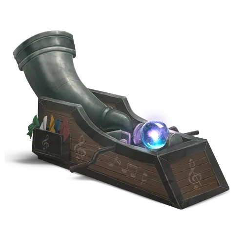 This siege weapon consists of a horn-shaped nozzle, a base typically decorated with ornate musical notes, and two cranks attached to both sides of the base. Crystalline resonating orbs made from powdered soniphak horn are inserted into a compartment within the base. Once an orb is loaded and the nozzle aimed, both cranks must be turned. This causes compressors within the base to grind away at the resonating orb, crushing it and releasing the sonic energy contained within. To reduce the likelihood of these weapons causing hearing damage, horns come equipped with earplugs and colored flags to enable crew members to communicate without the need for speech.
