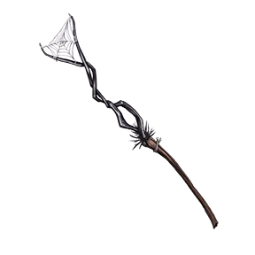 The handle of this wand is a 5-inch-long piece of rosewood, but most of its length is a pair of twisted spider legs covered in gossamer webbing.