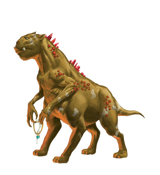 The reclusive and deceptive creatures called bauble beasts create false jewelry as a byproduct of their extremely bizarre magical digestive systems. Two natural skin conditions provide the raw materials for this process: scaly patches of thin layers of metal, and warts that resemble gemstones. By chewing loose these patches and swallowing them, a bauble beast magically constructs the jewelry in its guts. After passing the forgery, it polishes and reshapes the item to make it more convincing. The beast then sneaks into a settlement to place the jewelry somewhere it can be found. A creature who dons this false jewelry is compelled to fetch their real valuables and deliver them to the beast, which it happily collects. Some bauble beasts simply send the confused victim on their way, but other more evil bauble beasts slay them to avoid being found out.