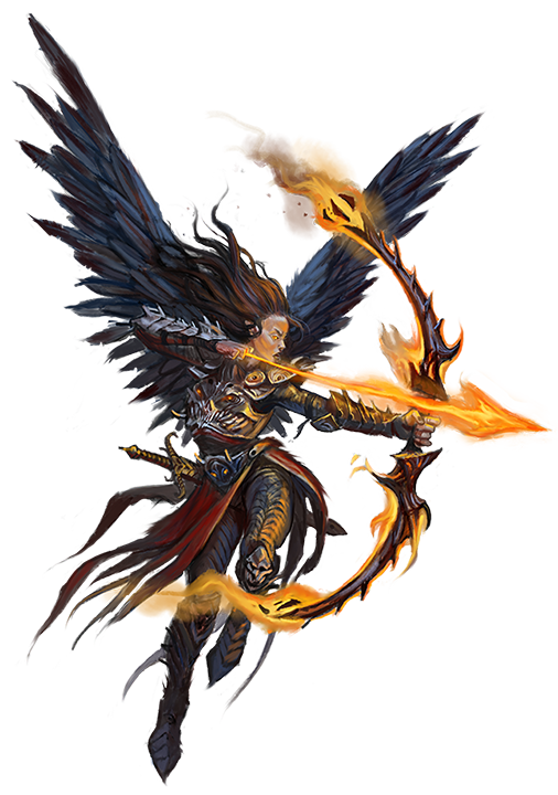 Erinyes exact vengeance and bloody justice for a creature’s crimes, torturing and punishing their victims in ironic fashion before allowing them the escape of death. While an erinys appears as a fallen angel and the first erinyes shared that origin, erinyes now originate in myriad ways, some promoted from lesser devils and others shaped from lemures themselves forged from the souls of torturers and persecutors. The erinyes’ origin is entwined with Eiseth, herself a fallen angel and one of Hell’s most powerful demigods. The first erinyes were all considered to be Eiseth’s metaphorical daughters, but erinyes formed since that time are no longer limited to a single gender.