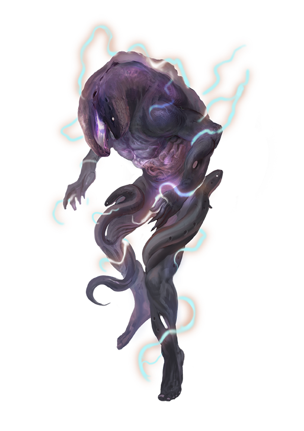A galvo is a bizarre humanoid creature made up of electric eels—dozens of them, transmogrified into one cooperative, electrified body. The story of their creation is lost to antiquity, though their propensity for attacking sea devils and alghollthus suggests they might have been engineered by some enemy of these creatures. Modern galvos aren't choosy about their prey, and because they can operate as well on land as they do in the water, they enjoy feasting on aquatic creatures and land dwellers alike.