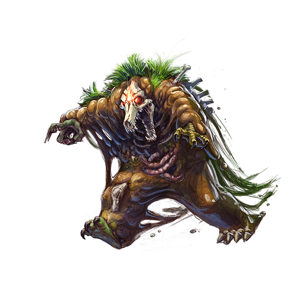 As their empire crumbled and fell into ruin, many cyclopes turned to increasingly depraved and vicious rituals to enhance their divinations and oracular powers. Some, especially those too fearful or suspicious of their fellow cyclopes to collaborate, constructed servants known as golgopos to aid in their rituals. These squat creatures are made from ancient bones dredged from fetid swamps and packed with mud to resemble a squat humanoid. Their heads are little more than the skull of whatever creature's bones were used in their creation with an extra eye socket punched in the forehead, glowing with eerie light.