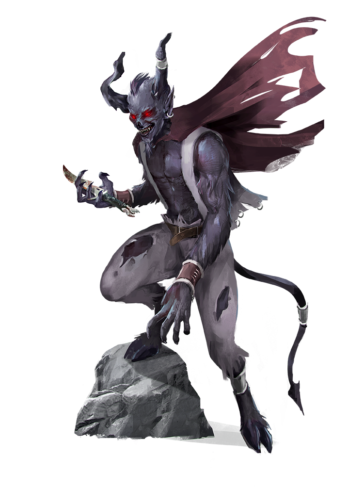Spring-Heeled Jacks are cruel-eyed, hairy fey with vaguely humanoid shapes and extra features that cause them to be easily mistaken for demons or devils. Glowing eyes, cloven hooves, menacing horns, and a pointed tail combine to create the mien of a wicked imp; his love of sudden and sadistic violence completes the impression. Almost all have jet-black skin and fur, though a few exceptions might exist.