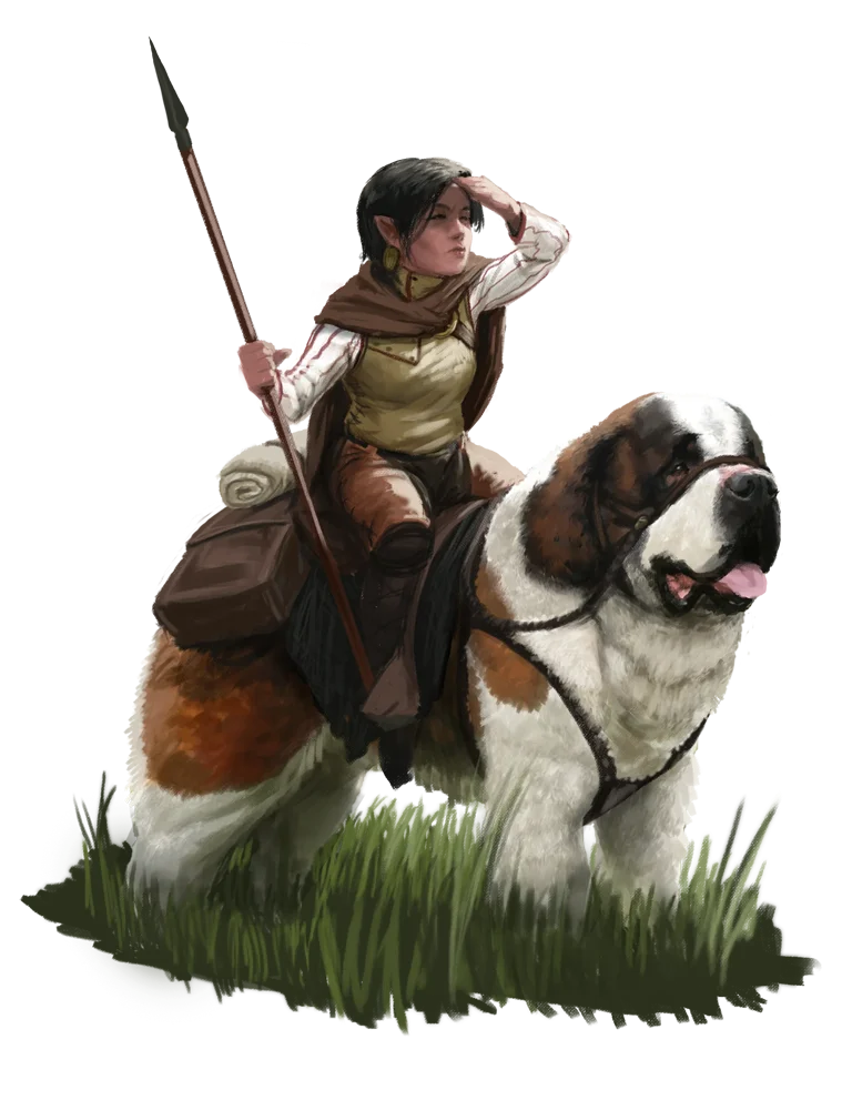 Dogs are trusted and loyal companions that serve as guardians, tracking animals, and pets. Their ability to detect prey or predators via scent and their predilection to accompany humanoids makes them ideal pets for most adventurers. There are hundreds of breeds of dogs in the world—from tiny lapdogs who shower their masters in affection to brawny hounds that stand nearly 4 feet high at the shoulder—and they can be found in nearly any place where people reside. Larger breeds might even be used as mounts for smaller adventurers, and some cultures use dogs as beasts of burden capable of pulling sleds loaded with supplies across the icy tundra. Regardless, many adventurers find value in having a dog.