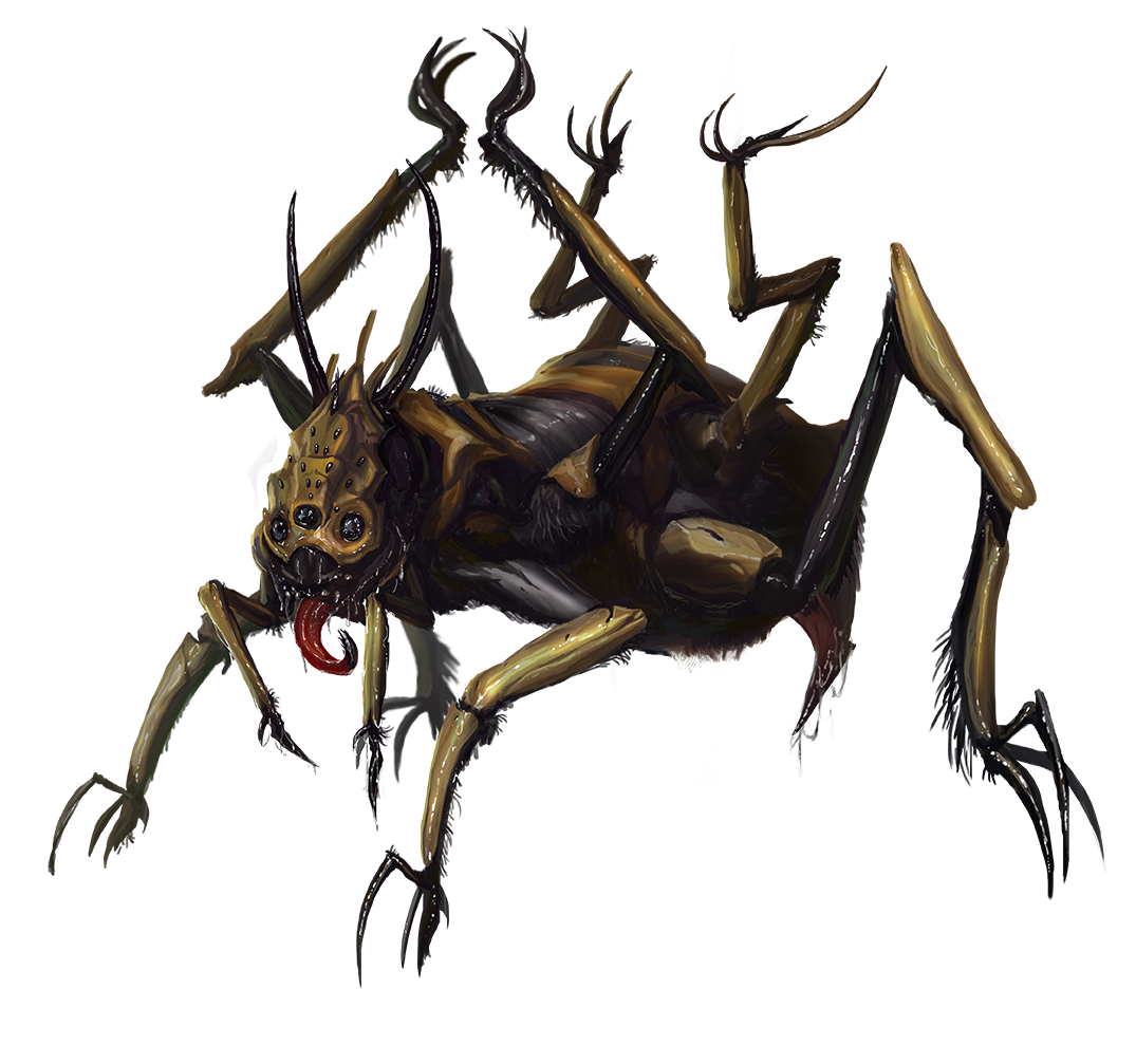 A tixitog usually hides from the spiders in the lair it has claimed, not out of fear but to keep the spiders from abandoning the lair and moving elsewhere. When a tixitog emerges from the shadows, most spiders flee from it rather than attack, and the tixitog uses this behavior to direct entire swarms of spiders where it pleases. This is typically bad news for bands of adventurers who find themselves within a tixitog’s lair; in the mass hysteria caused by a skittering swarm of spiders headed straight toward them, spelunkers typically fail to notice the more dangerous threat that follows closely behind.