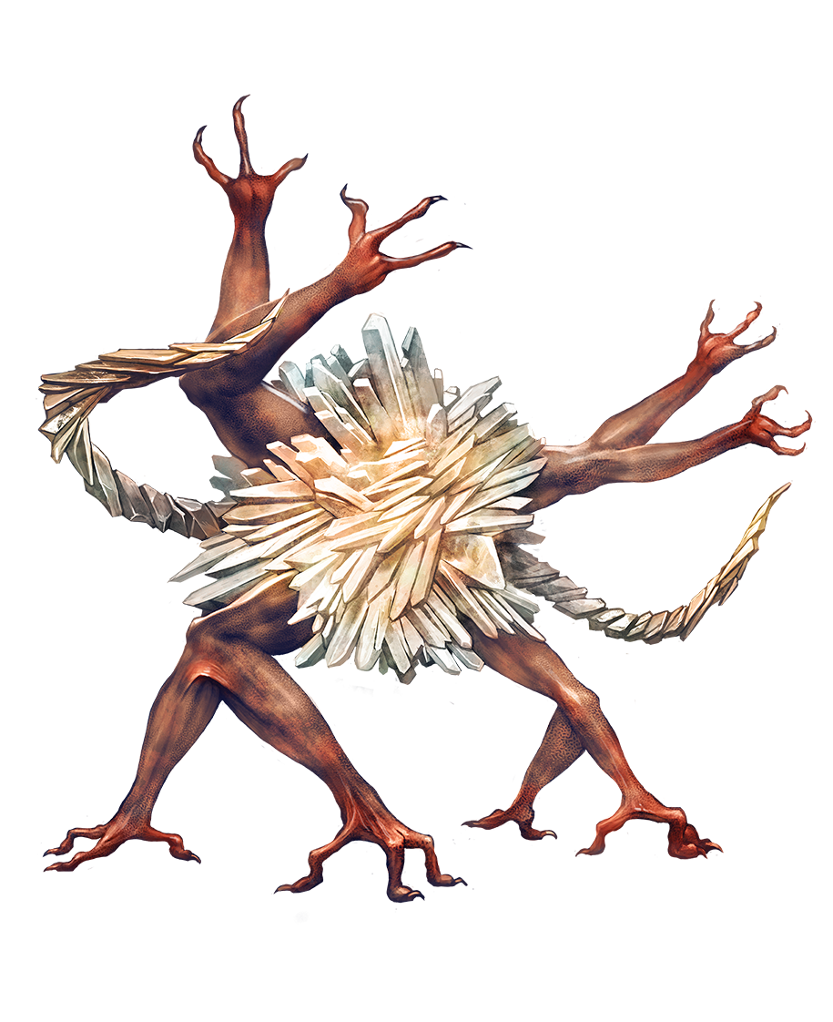 Theletoses maintain the balance between fate and free will. A theletos is a roughly spherical mass of crystals from which emerge four limbs, each split at the elbow and ending in three-fingered hands. A pair of crystalline tentacles also emerges from its body. Those who have been damaged by a theletos's tentacles describe a disorienting dilemma as they simultaneously feel forced to make a single choice while also being overwhelmed by the endless options available to choose from. Theletoses are more likely than most aeons to interfere in non-aeon societies, particularly in regions with draconian laws. Their involvement is twofold; a theletos concerns itself with both the freedom of individuals and the laws that restrict these individuals, even (or especially) when the two are in opposition.
