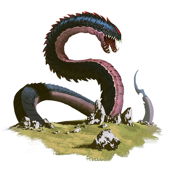 Cave worms are infamous for being nearly unstoppable and for swallowing their prey whole. A cave worm also ingests earth and minerals as it tunnels. The worm processes some of these minerals, resulting in its armored hide and toxic sting, while it leaves others behind—often including treasure or other valuables that incidentally serve to lure explorers into the worm’s proximity and, more often than not, its gullet. While not completely mindless, cave worms are difficult to train, and most attempts to domesticate them (in theory, a cave worm would make an excellent mining resource) result in disaster.