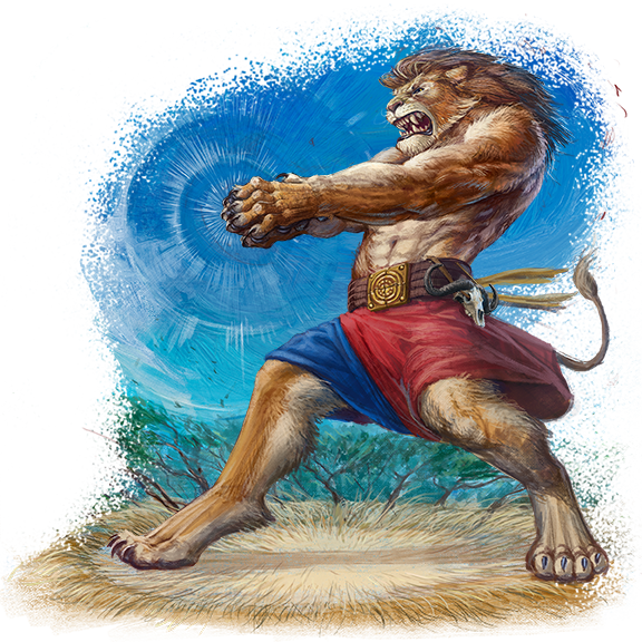 The rolling thunder before the rain provides the massive, leonine humanoids known as slanas with a tremendous power. These solitary and nomadic creatures primarily dwell in the jungles and savannas of the Mwangi Expanse, but they can range into nearby areas in search of prey or when drawn by strange primal forces only slanas can recognize. Slanas view each other as rivals who test each other's prowess, so when drawn together by this strange calling they nearly always fight to the death. A slana's roar echoes like thunder across the countryside, and denizens of the Mwangi fear a slana's approach whenever an oncoming storm's thunder seems more ferocious than its rain.