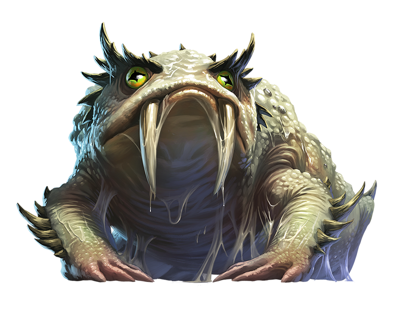 The slurk is a sticky, tusked frog-beast found in underground lairs and caves. It has two massive tusks, which it uses to gore prey and tangle with rival slurks. With the slurk’s natural ability to climb walls and cling effortlessly to ceilings, it can be easy for unwary cave explorers to end up on the wrong end of the beast’s formidable ivory tusks.