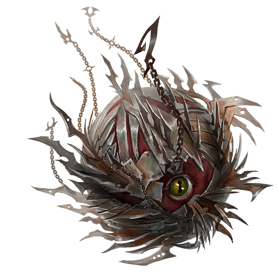 These spherical monsters made of sinewy muscle, serrated blades, and bloody metal are the most common velstracs on the Shadow Plane. Each augur has only a single eye, from which it can see the horrors inflicted upon it by other velstracs, who train the augur to expect and appreciate pain. Augurs are 1 foot in diameter and weigh 30 pounds.