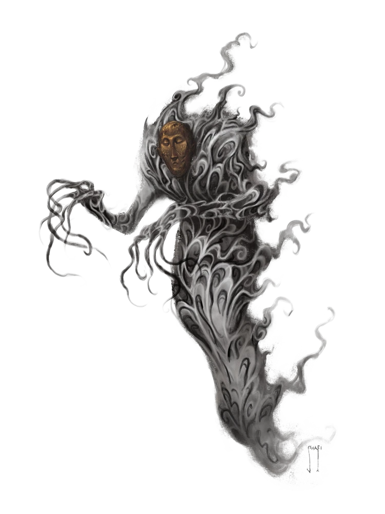 While a dalgyal gwishin has little more than a ghostly body made of mist, the featureless stone mask it wears on its head is solid. Even the stolen faces it claims are transitory, cracking off after a day to form what looks akin to a fragile porcelain death mask. Some of these lonely spirits keep these masks and add them to a collection in a remote and forlorn lair, hoping to find companionship in an ever-growing display of silent faces.