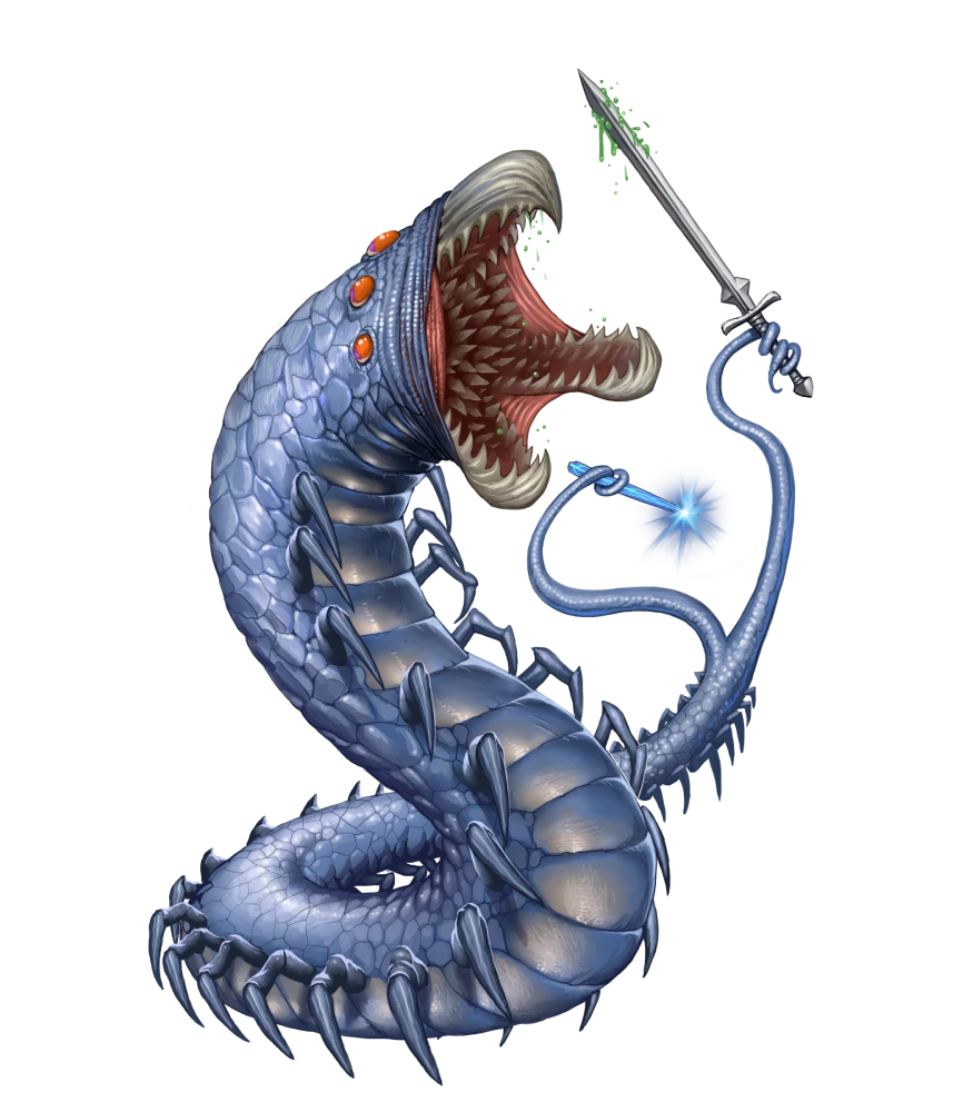 Melee [one-action] bite +19 [+15/+11] (agile, finesse), Damage 2d8+11 piercing plus seugathi venomMelee [one-action] longsword +20 [+15/+10] (magical, reach 10 feet, versatile P), Damage 2d8+11 slashing plus 1d6 acidOccult Innate Spells DC 28, attack +20; 5th black tentacles, synesthesia; 4th dispel magic, grim tendrils; 3rd hypercognition, levitate, mind reading (×3); Cantrips (5th) daze, detect magic, mage hand, telekinetic projectile