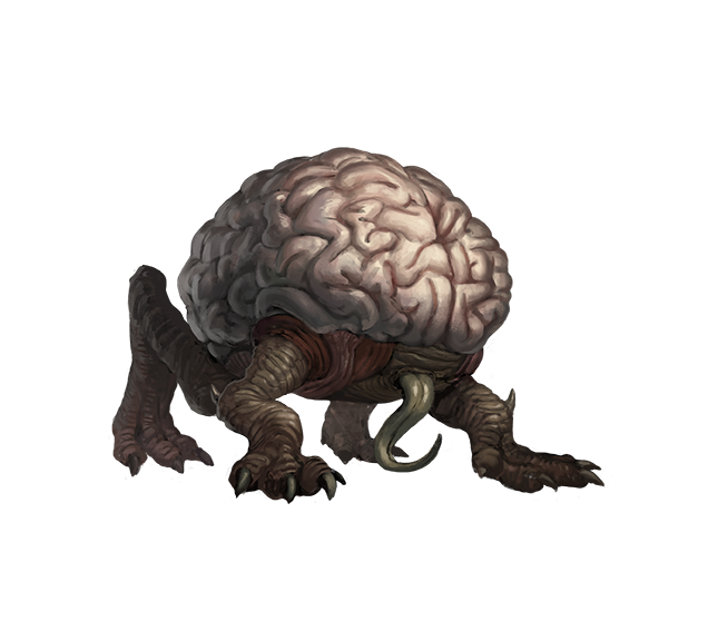 Intellect devourers serve as advance scouts and infiltrators for the powerful force of alien beings called the Dominion of the Black. These monsters roam the Darklands, from which they mount secret invasions of the world above. When an intellect devourer infiltrates a society, its first priority is to acquire a body. It might first seek out a graveyard for a fresh corpse, as this is easier than fighting and killing someone. When the aberration compresses itself into the host's brain cavity, its real body goes dull to sensation as it connects to the nervous system of its host. If found out, an intellect devourer might quickly inhabit a new body to make its escape, preferably something inconspicuous such as a domestic animal.
