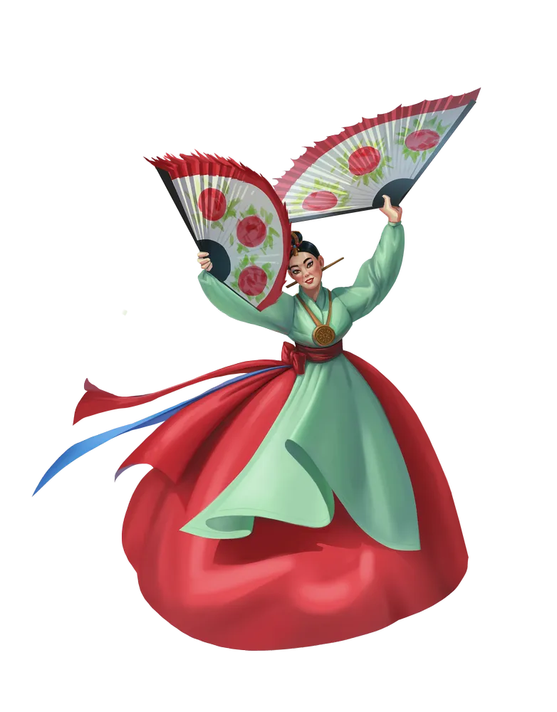 Fan dancers display exceptional elegance and control as they drift across the stage, specializing in spinning movements that are, at times, like a trickling brook and, at others, a swift and powerful river. While some fan dancers use their skills to gain the advantage in combat, others adeptly manipulate their fans to distract their enemies and create openings for their allies.