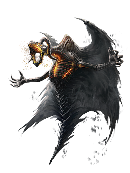 Ankous are shadowy killers who serve powerful fey creatures, or even the Eldest— the demigods of the First World. Amid the courts of the Eldest or of powerful fey rulers, these sinister assassins lurk overhead as they await the call to action—implied threats akin to deadly weapons hung as decor in a royal hall. Ankous never speak aloud; when they feel the need to communicate at all, they do so in a telepathic whisper directly into a victim's mind. While an ankou's body is made of strange, fleshy material, their claws and the cruel hooks on their wings are made of razor-sharp cold iron, a quality that makes them much feared among other fey. A typical ankou is 10 feet tall and has an 8-foot wingspan but weighs less than 80 pounds.