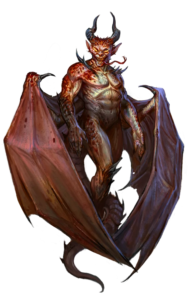 Masters of corruption and architects of conquest, devils seek both to tempt mortal life to join in their pursuit of all things profane and to spread tyranny throughout all worlds. The temptations they offer mortals range from great powers granted by the signing of an infernal contract to twisted favors following a whispered pledge to a diabolic patron, or any number of even subtler exchanges. Those who succumb to these temptations find themselves consigned to an afterlife of endless torment in the pits of Hell, wherein the only hope of escape lies in the chance of being promoted to become a devil in the infernal ranks.