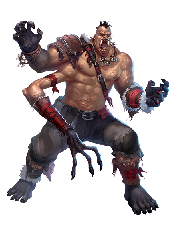The towering and brutish giants known as athaches are reviled for both their monstrosity and their cruelty. Beyond an athach's filthy habits, this giant is made stranger by the gangly third arm that protrudes from their torso and ends in a twitching, long-fingered claw. Huge, tusk-like fangs descend from an athach's upper jaw and prop their mouth open, leaking long strands of viscous drool that is itself is a toxic venom and coats the athach's fangs.