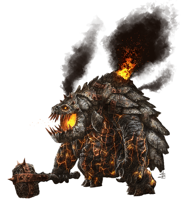 Melee [one-action] warhammer +40 [+35/+30] (magical, reach 25 feet, shove), Damage 4d12+18 bludgeoning plus 2d6 persistent fire damageMelee [one-action] jaws +39 [+35/+31] (agile, reach 25 feet), Damage 4d10+18 piercing plus 2d6 persistent fire damageRanged [one-action] rock +39 [+34/+29] (brutal, range increment 120 feet), Damage 4d6+18 bludgeoning plus 2d6 persistent firePrimal Innate Spells DC 46; 10th cataclysm; 9th fireball, meteor swarm; 8th earthquake; 7th plane shift (to the Material Plane, Plane of Fire, or Plane of Earth only); Cantrips (10th) produce flame