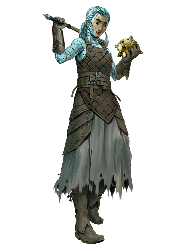 Despite having long inhabited Golarion, albeit in small numbers, taloses have only rarely been recognized as geniekin. The largest number of them, and also the largest number whose true nature is known, inhabit Tian Xia. The traditions of metal as an element have lived much longer there. Taloses often find themselves drawn to discussions and study of elemental metal the instant they hear of the concept. Historical records speak of renowned courtiers and diplomats with skin of flawless silver or bronze. In the Ivory Port of Goka, the smiths of the family-owned Dragon's Iron Forge craft their blades and firearms with magnetic techniques handed down from their zuhra sheikha ancestor.