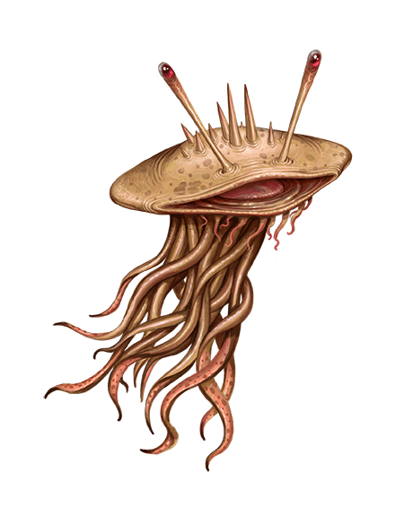 Flumphs are small, jellyfish-like creatures who normally float about 5 feet off the ground on a self-generated cushion of wind, directing their movements with jets of air from countless tiny pores on the surface of their bodies. With some effort, the flumph can force air through these openings in a way that roughly approximates humanoid speech, albeit in a squeaky and halting tone.