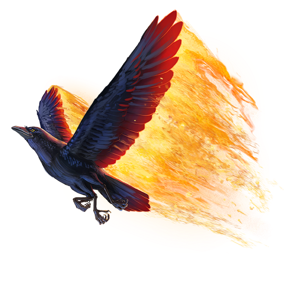 Those who feast on the sun are said to carry its power within them. Sanzuwus are small crows with red plumage and dark throats. According to legend, they stole their burning power from the sun and now fly across the sky as blinding streaks of fire. When they land on the earth, it ignites around them, causing unbound destruction. A handful of people worship these radiant birds and inscribe their three-legged visage on coins, items, and weapons.