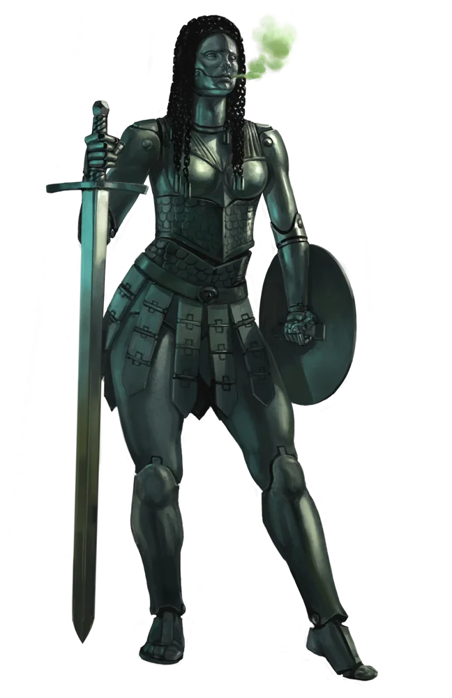Traditionally crafted into the forms of giant suits of armor or powerful animals, iron wardens are products of exquisite artistry and skill. Their articulated joints and sturdy, armored bodies require great care and mathematical precision to craft, and regular cleaning and oiling ensure they don't rust over the ages. With proper care, iron wardens can remain in good shape for thousands of years, being passed down for generations, as long as they aren't destroyed by meddlesome adventurers. In addition to their incredible strength, iron wardens possess a potent toxic breath that is often more than enough to dispatch entire groups of opponents.