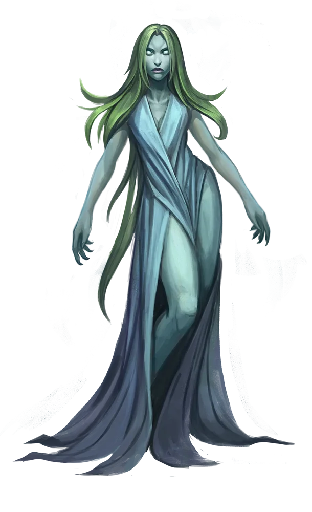Naiads protect streams, ponds, springs, and other natural bodies of fresh water. While most naiads lead solitary lives close to their chosen home, sometimes they congregate in coven-like groups where river tributaries meet, performing great magic and blessing the waters of the land. Because naiads' bonds to their bodies of water permit more flexibility, they are the nymphs most likely to interact with humanoids—and even visit their settlements on occasion. Unlike other nymphs, naiads occasionally become adventurers, especially when dark forces seek to despoil nature or otherwise threaten the land, joining forces with others to prevent the corruption of the natural world.