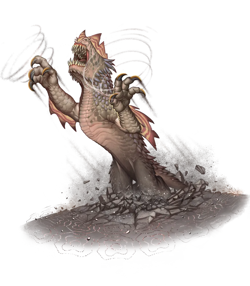 Morthaks, being low, squat, and flat, resemble a crocodile rebuilt to dig like a mole. At home beneath vast meadows and plains, the only sign of their passing are the earthen mounds they leave behind when they emerge to hunt. Those who encounter them in the wild speak of the sub-aural rumble they produce as they disintegrate the earth with sonic blasts, a sound that's felt rather than heard.