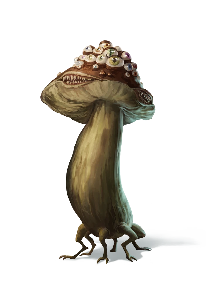 With its mottled green-and-tan rubbery flesh, six short legs ending in two-clawed feet, and three circular mouths arrayed equidistantly around a disk-shaped head crowned by multiple bulbous eyes, the bizarre Darklands-dwelling ockomlire's strange appearance blurs the line between aberration and fungus.