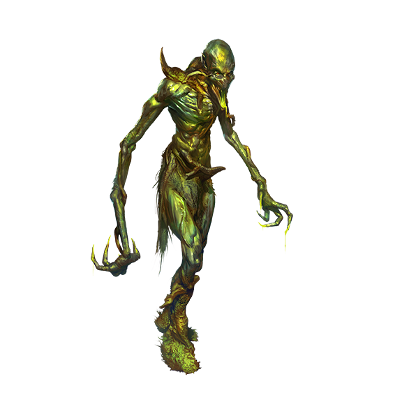 Grimstalkers are gaunt and hairless, and their mottled, green and brown flesh gives them the appearance of moss-draped bark. When damaged, they bleed a thick, sap-like blood. They mark their territories by lopping off the heads of their victims and stringing them up in the surrounding trees, a practice that often lures dangerous scavengers into their lands. Carnivorous and thorny plants are often found in wilds where grimstalkers dwell, filling roles that pets might in human society, though grimstalkers tend to treat these “pets” poorly at best.