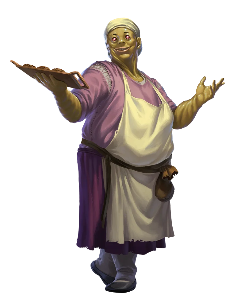 Sweet hags use bright colors, pleasant visages, and sugary treats to draw in children and the young at heart. Their favorite prey is impoverished youngsters who are unlikely to be missed—sweet hags offer them food and a veneer of kindness before devouring the hapless child. Sweet hags also enchant their food to magically charm others, often using these bespelled servitors to handle all of their busywork. Though they present a lovely and generous face to the world, they turn vicious when insulted or defied. A sweet hag's true form is a dribbling mass of flesh with gumdrop eyes, often resembling melting taffy.