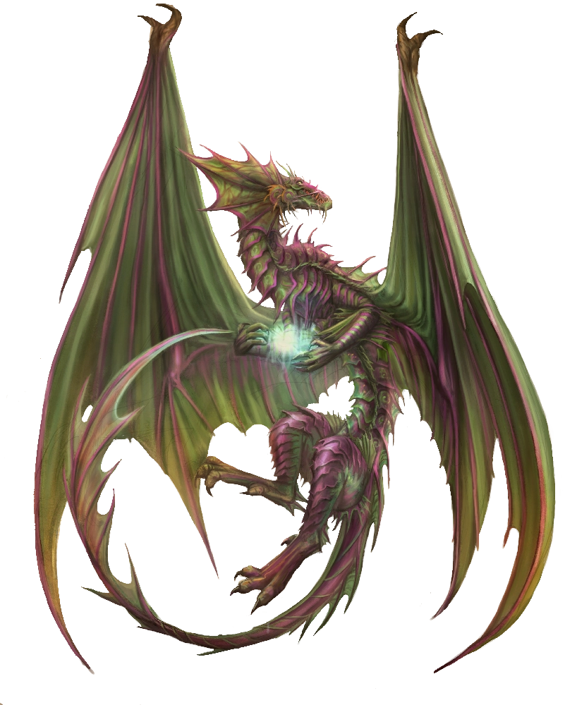 Occult Dragons: At times alien and off-putting and other times alluring and mysterious, occult dragons derive their powers from the inexplicable and unknown. These dragons use magic that seems to exist within the crevices and shadows between other forms of magic. Whether it's due to this strange magical influence or something else, occult dragons are most likely to directly interact with other creatures. While generally sporting similar builds to other dragons, occult dragons make greater use of their wings as supplementary appendages, leaving their forward limbs free to use for other things. Their scales and plating generally feature strange shapes and patterns that are rarely seen in the natural world.