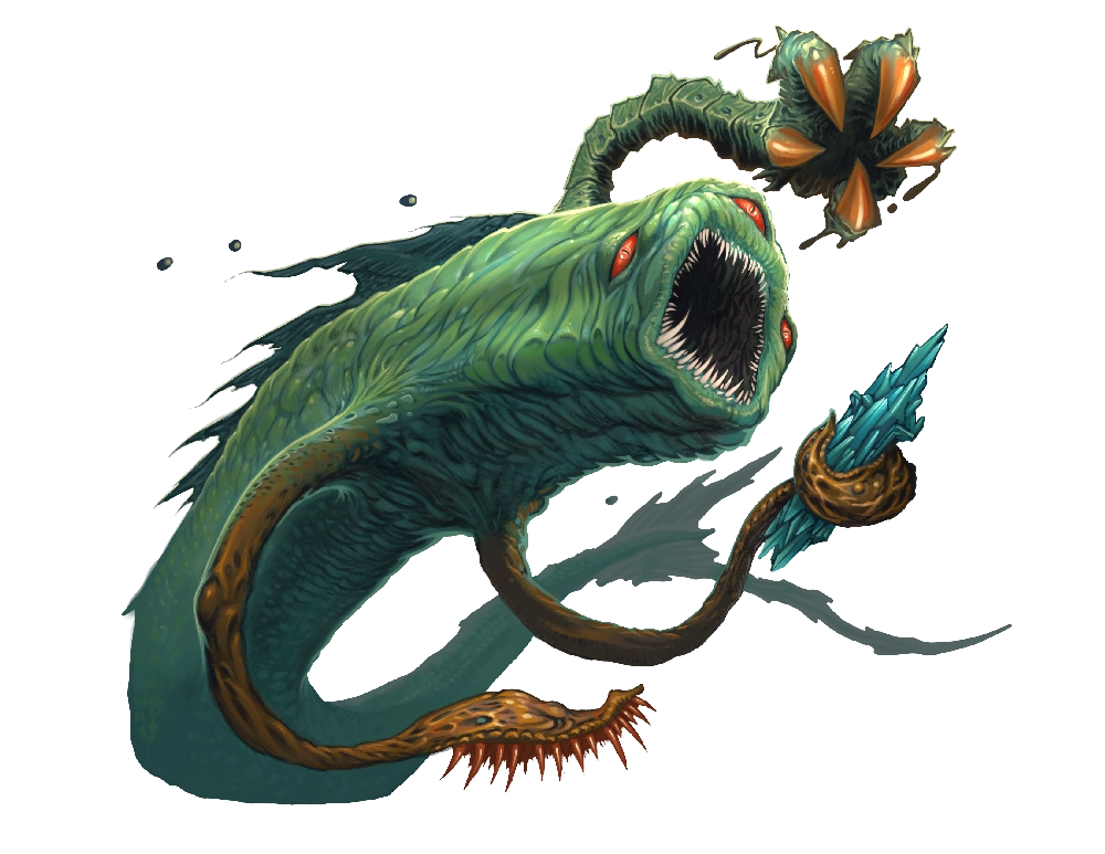 While the veiled masters are the rulers of alghollthu society, they are not the most powerful of their kind. Greater, more mysterious creatures that function as organic thought networks, immense aquatic engines of war, or specialized extractors of forgotten secrets dwell among their sunken cities. Meanwhile, the world above remains infested with creatures that were originally created by the alghollthus but have long since drifted away from their aquatic progenitors to become their own sinister monstrosities.