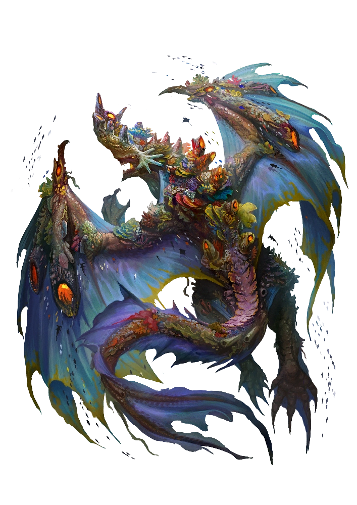 Source Monster Core 2 pg. 120Coral dragons are the primal guardians of the vast living coral reefs found in oceans across Golarion. Even by draconic standards, coral dragons stand out for their arrogance and vanity, boasting inordinate pride in the vibrant hues of their own coral-encrusted scales and the dazzling splendor of the reefs they protect. Coral dragons like to decorate their reefs, which they view as lairs, with objects of beauty, dotted with the occasional bit of valuables like coins. Those who seek the favor of a coral dragon often find the creature easily swayed by flattery, particularly when paired with shiny or brightly colored gifts that complement the scintillating beauty of the dragon and their underwater domain.